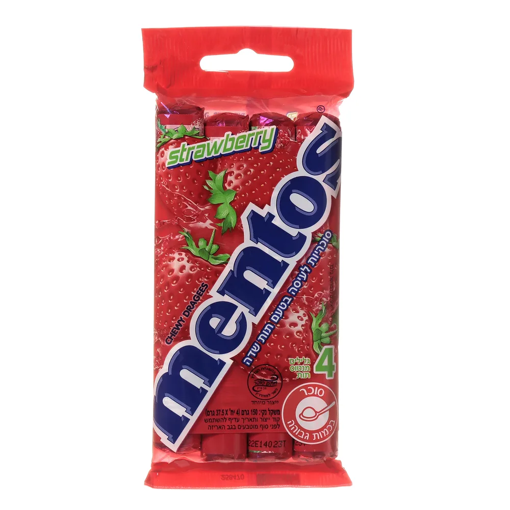 סוכריות לעיסה בטעם תות : מנטוס . 4 יח של 37 גרם